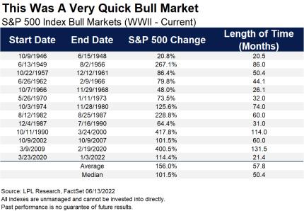 2) The bull market that just ended lasted only 21 months from the March 2020 lows until the January 2022 peak, checking in as the shortest bull market since WWII. As noted above though, it was also the quickest to ever double. Wow.